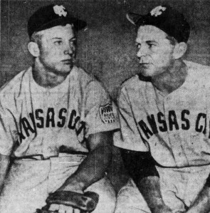 Kansas City Blues 19-year-old outfielder Mickey Mantle (left) sits next to Blues manager George Selkirk (right).